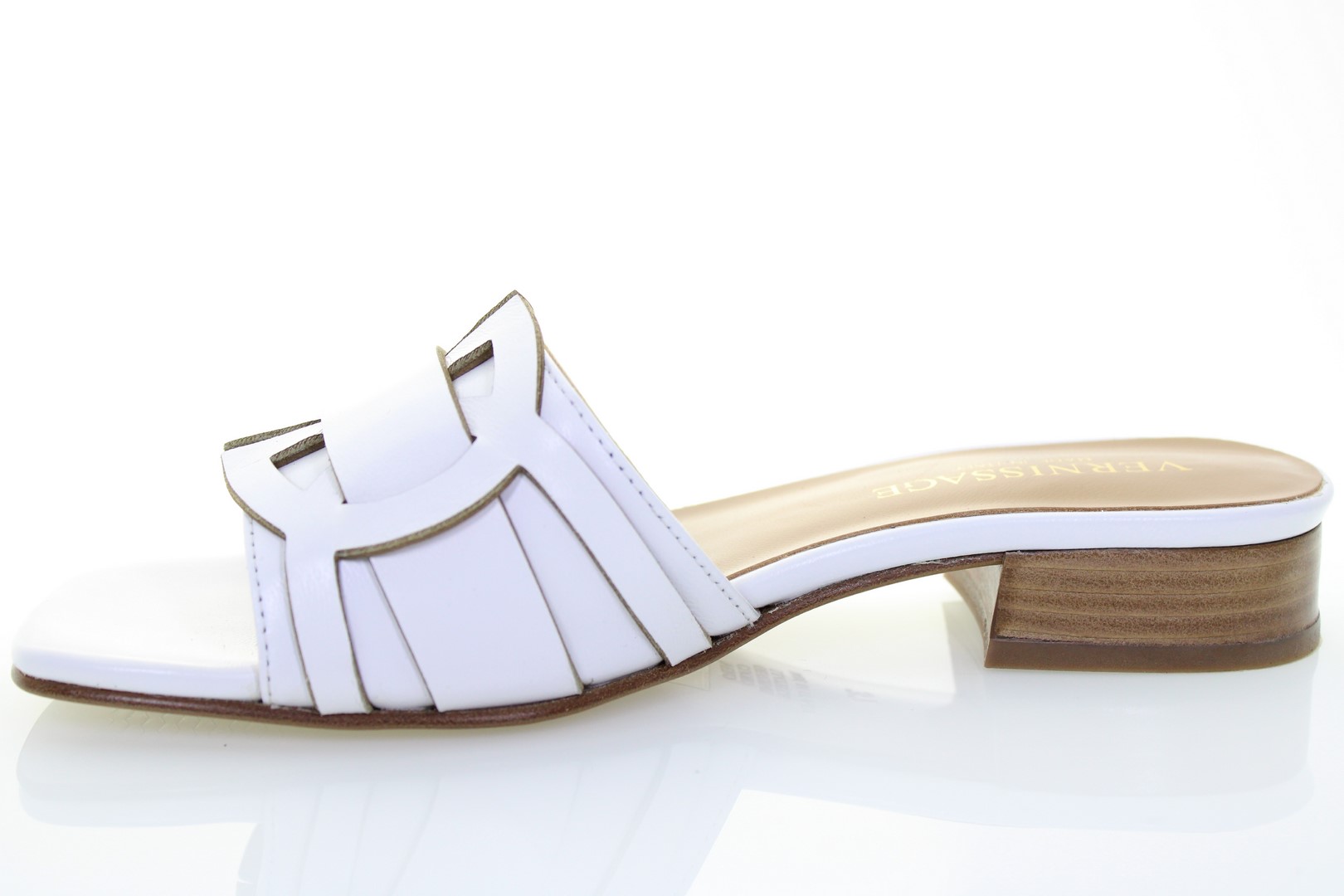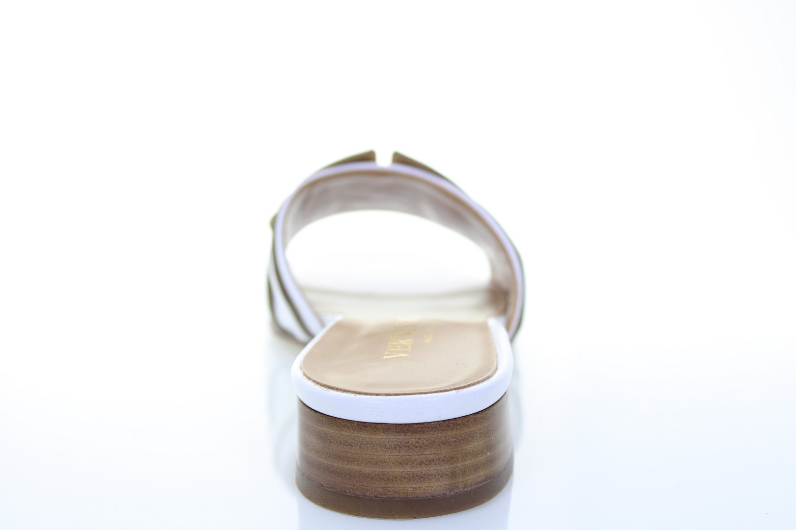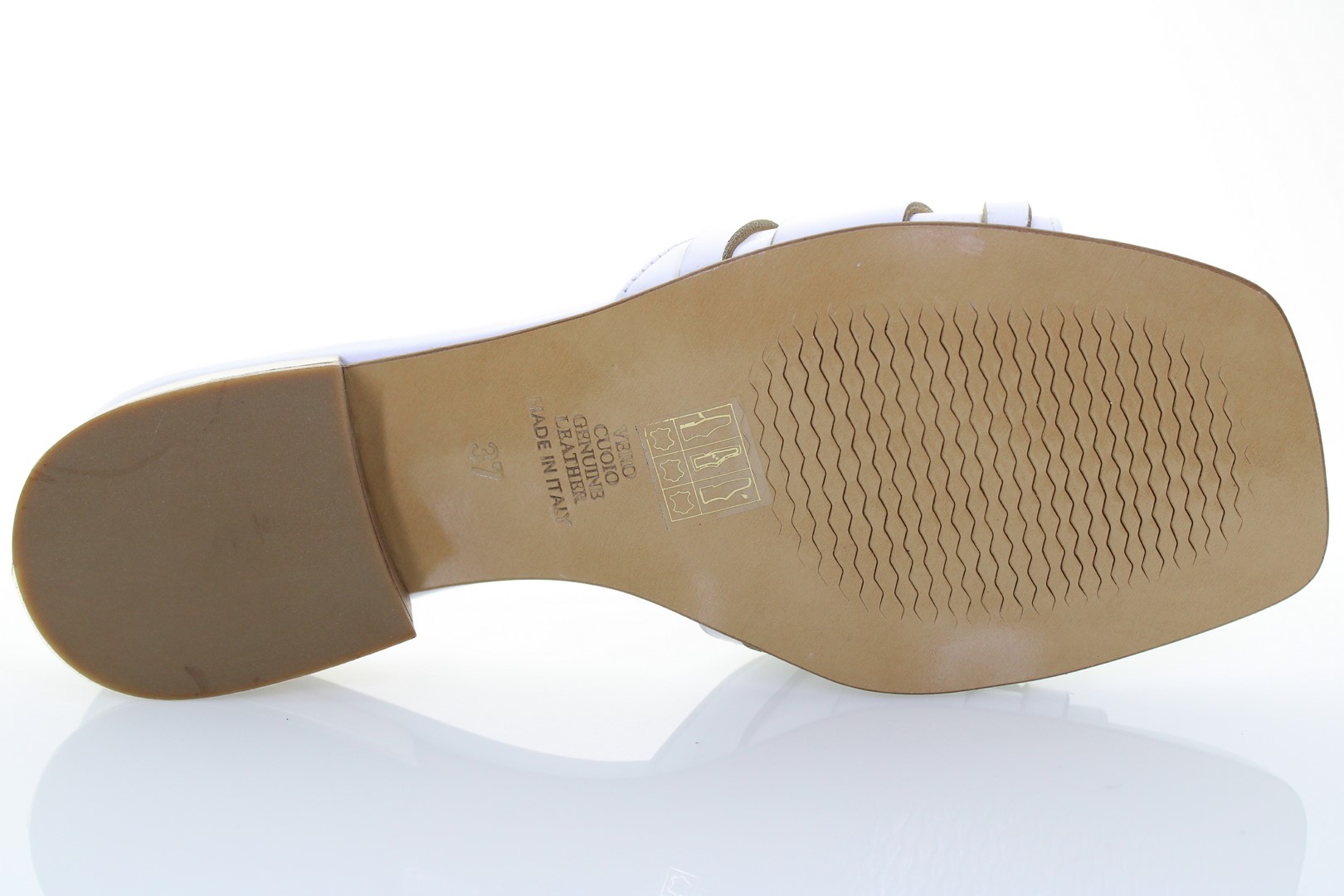 Ciabatta realizzata in pelle con lavorazione al laser, fodera e sottopiede in pelle, suola in vero cuoio e tacco 2 cm. Perfetta per la giornate d'estate