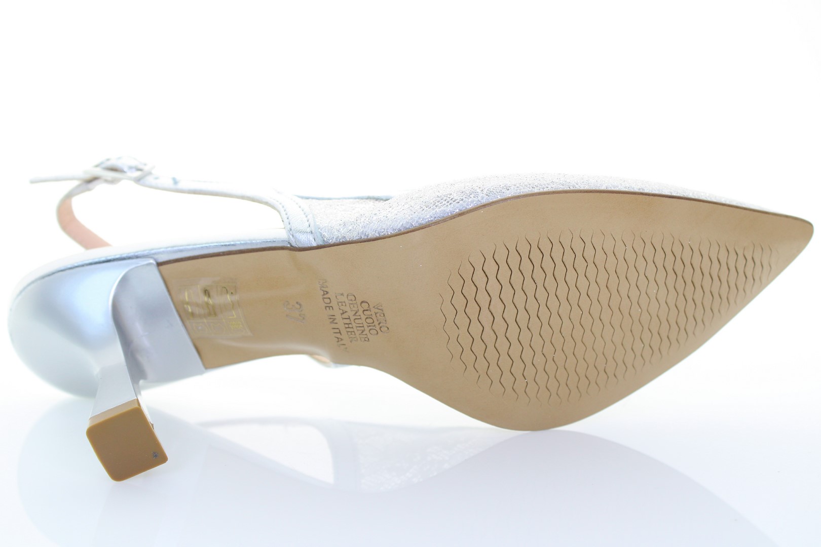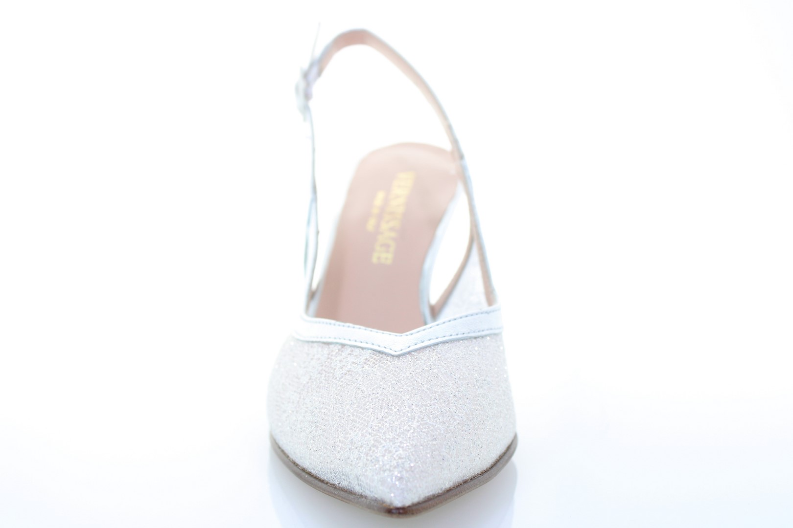 Brilla con eleganza ad ogni passo con questa décolleté aperta dietro realizzata rete effetto glitter e pelle laminata, ideale per cerimonie ed eventi speciali.