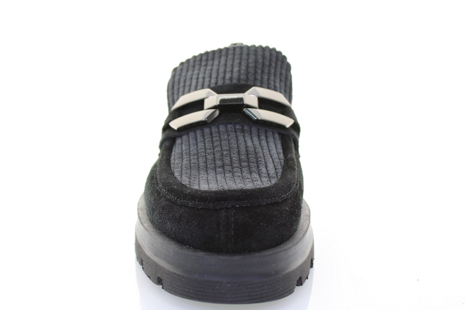 Mocassino in pelle scamosciata con vaschetta in velluto arricchita da accessorio ornamentale, fascia elastica sotto lo scollo del piede per una migliore calzata, fodera e sottopiede pelle, soletta imbottita in Memory Foam, fondo in altri materiali altezza 4,5 cm. 100 % Made in Italy