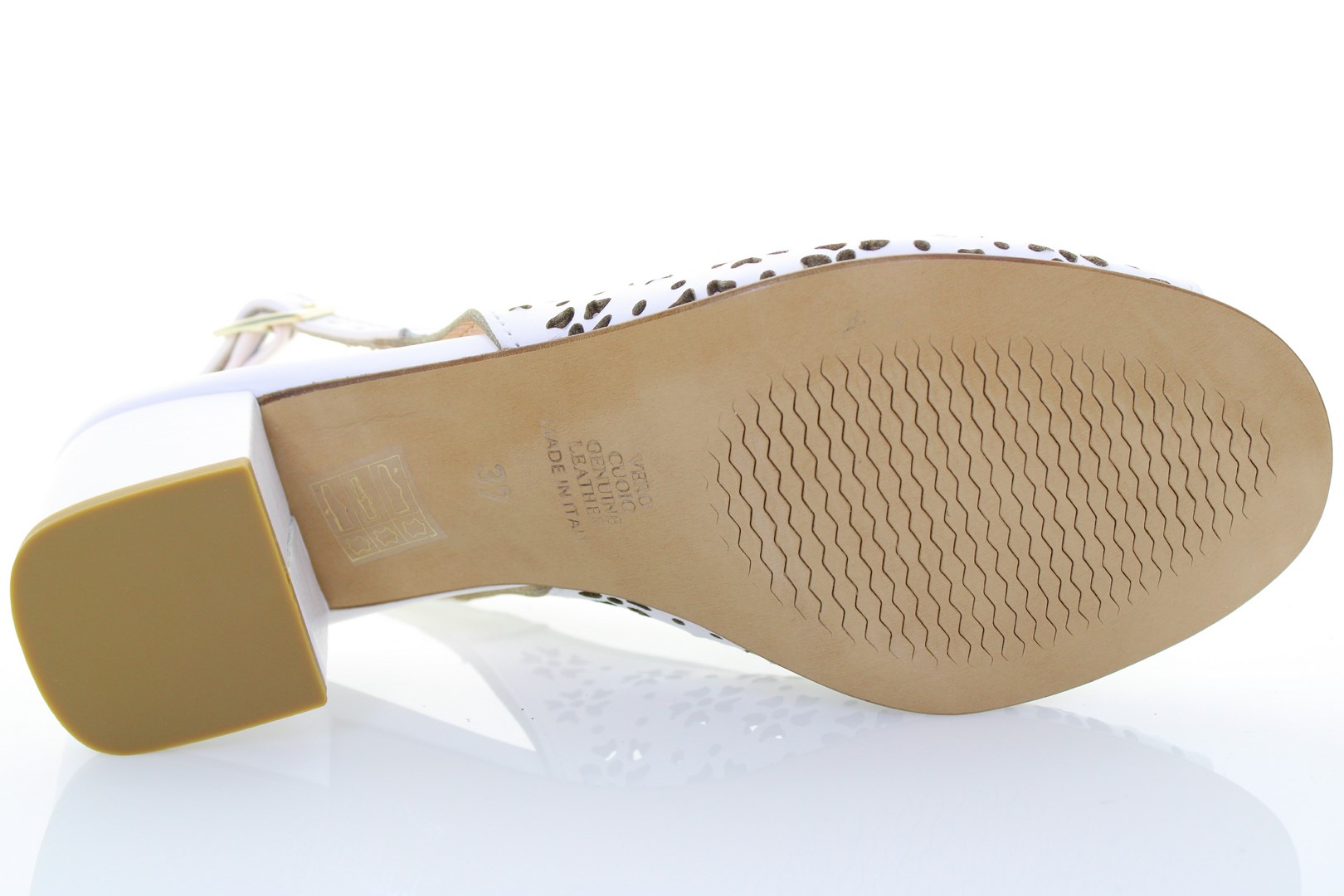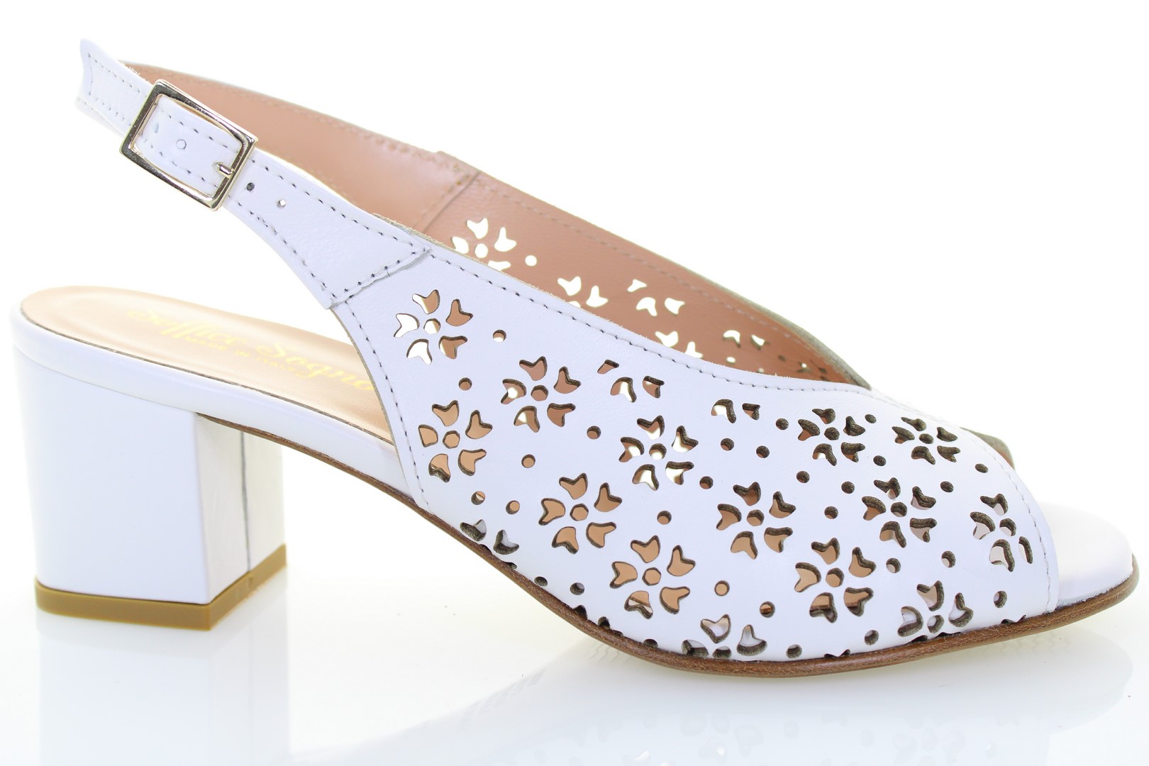 Sandalo in pelle nappata arricchito da lavorazione laser, suola in cuoio e tacco ricoperto di 6 cm. La conformazione della tomaia è studiata per abbracciare il piede in modo uniforme; la lavorazione al laser crea un effetto vedo non vedo ideale per chi cerca un sandalo elegante ma sobrio. Ideale per cerimonie ed eventi