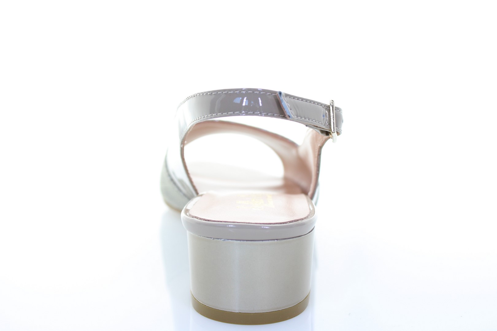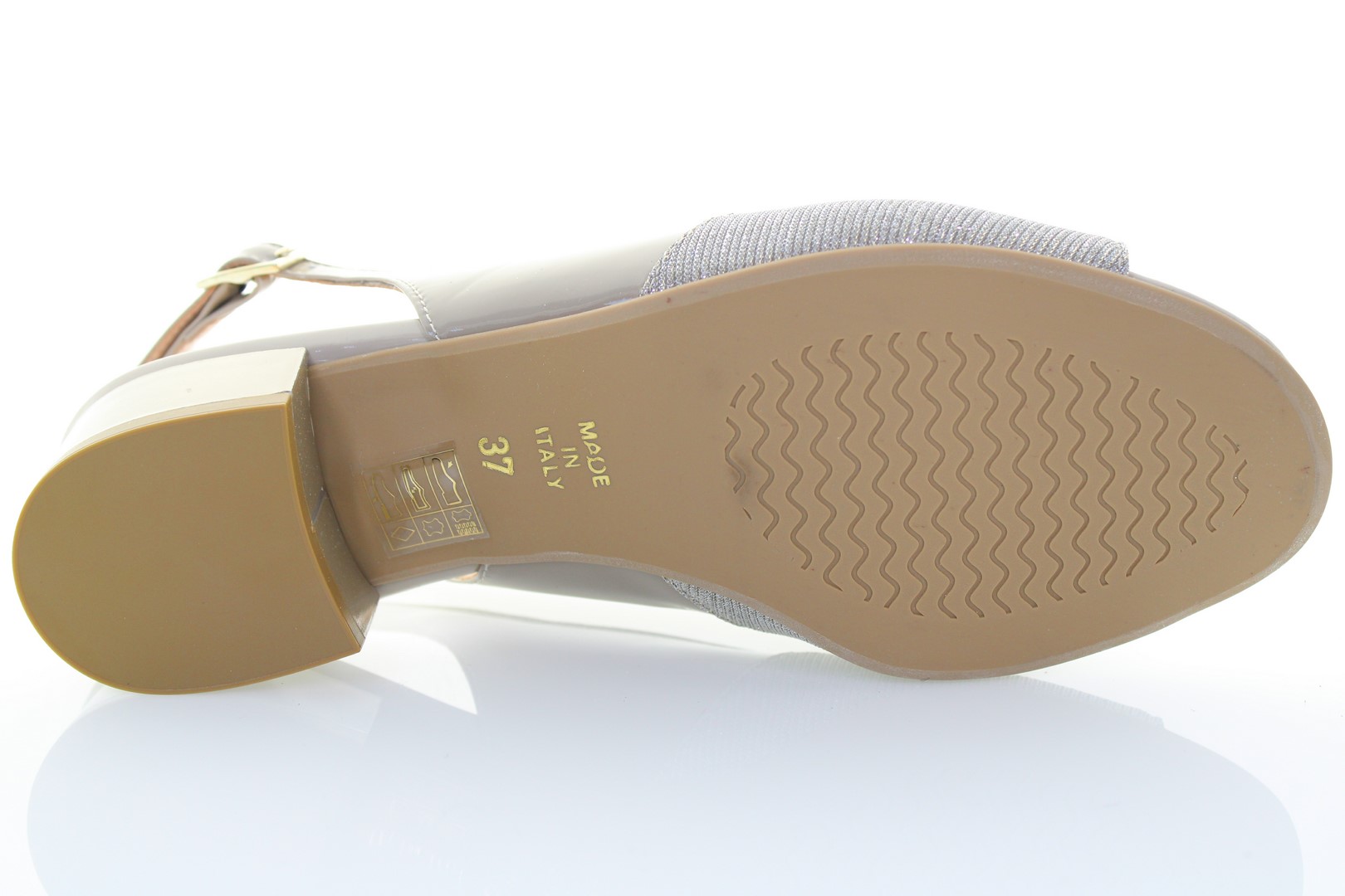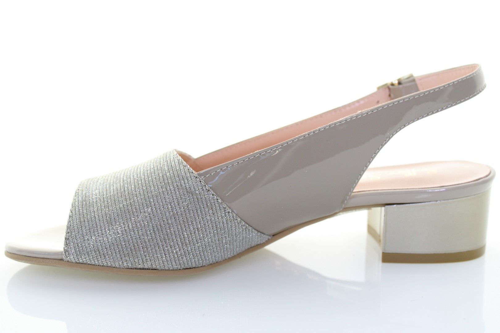 Sandalo elegante realizzato nella fascia frontale in tessuto effetto glitter e lateralmente e cinturini in pelle effetto vernice. La morbida imbottitura della soletta, il tacco di 3 cm e la suola in materiale gommoso lo rendono perfetto per cerimonie e eventi in cui si necessita eleganza senza rinunciare alla comodità.