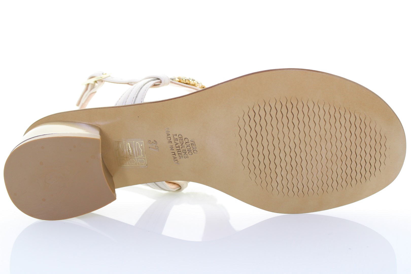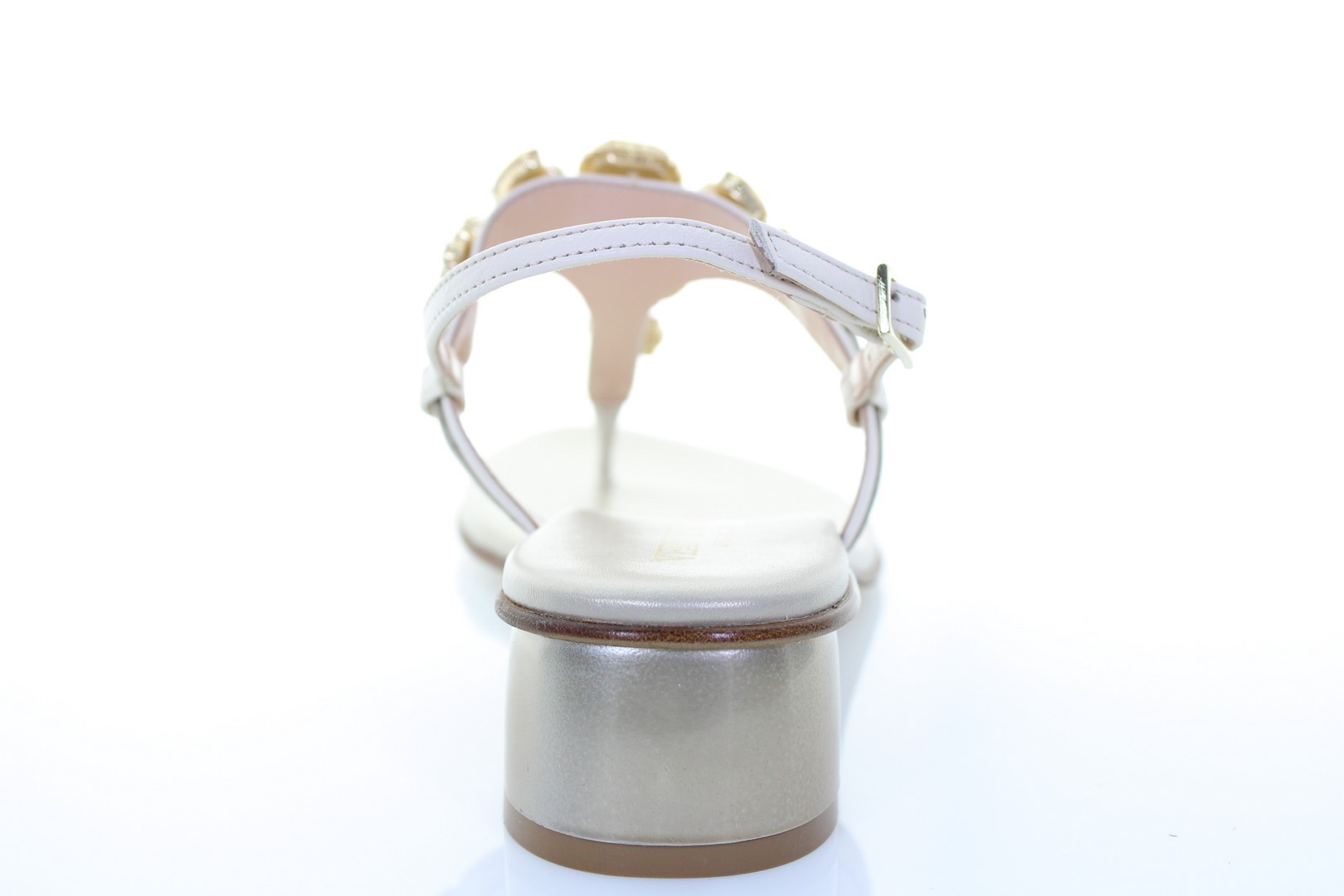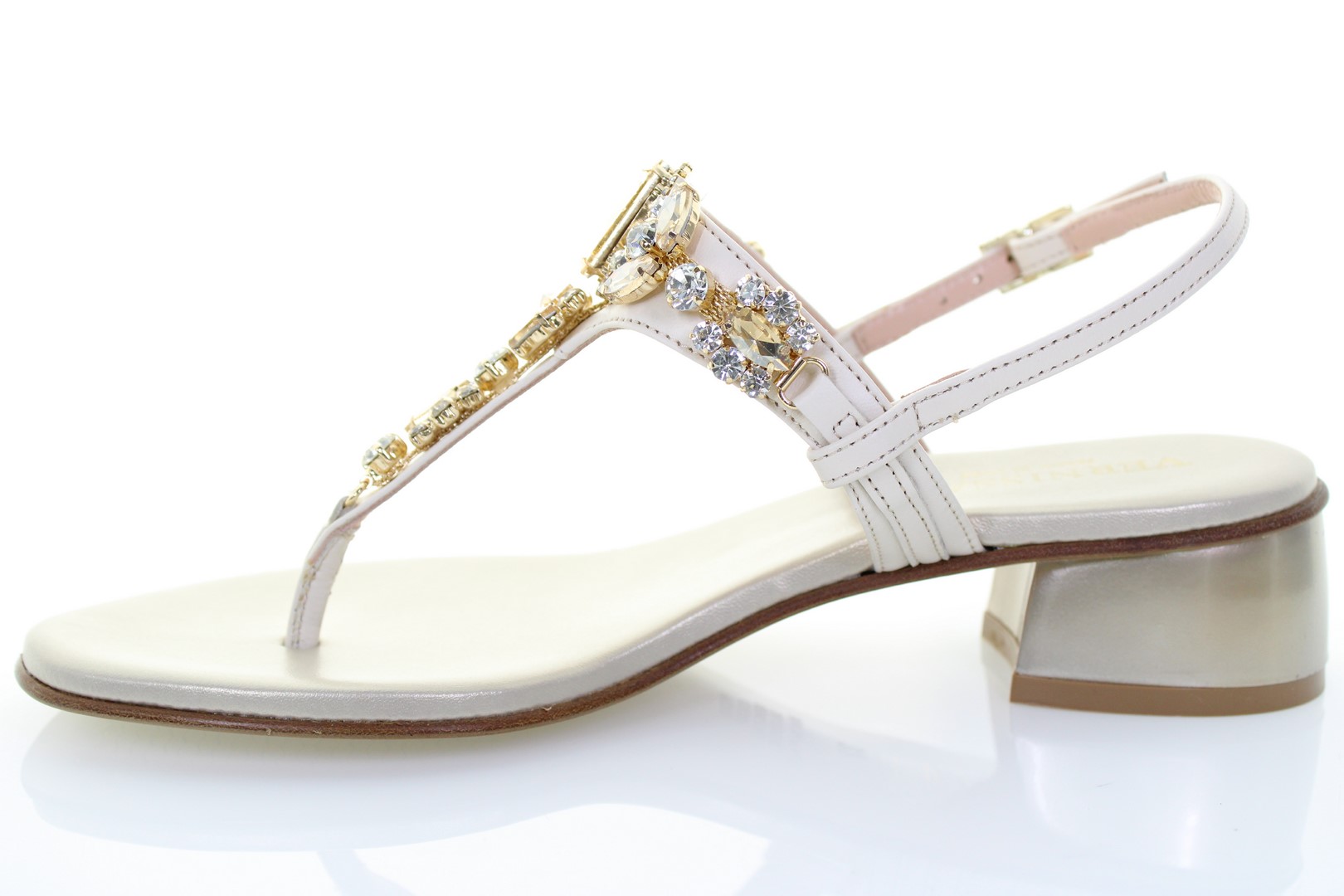 Sandalo infradito stile positano in pelle laminata arricchito accessorio con pietre, soletta imbottita in Memory Foam, suola cuoio, tacco 3,5 cm. 100 % Made in Italy