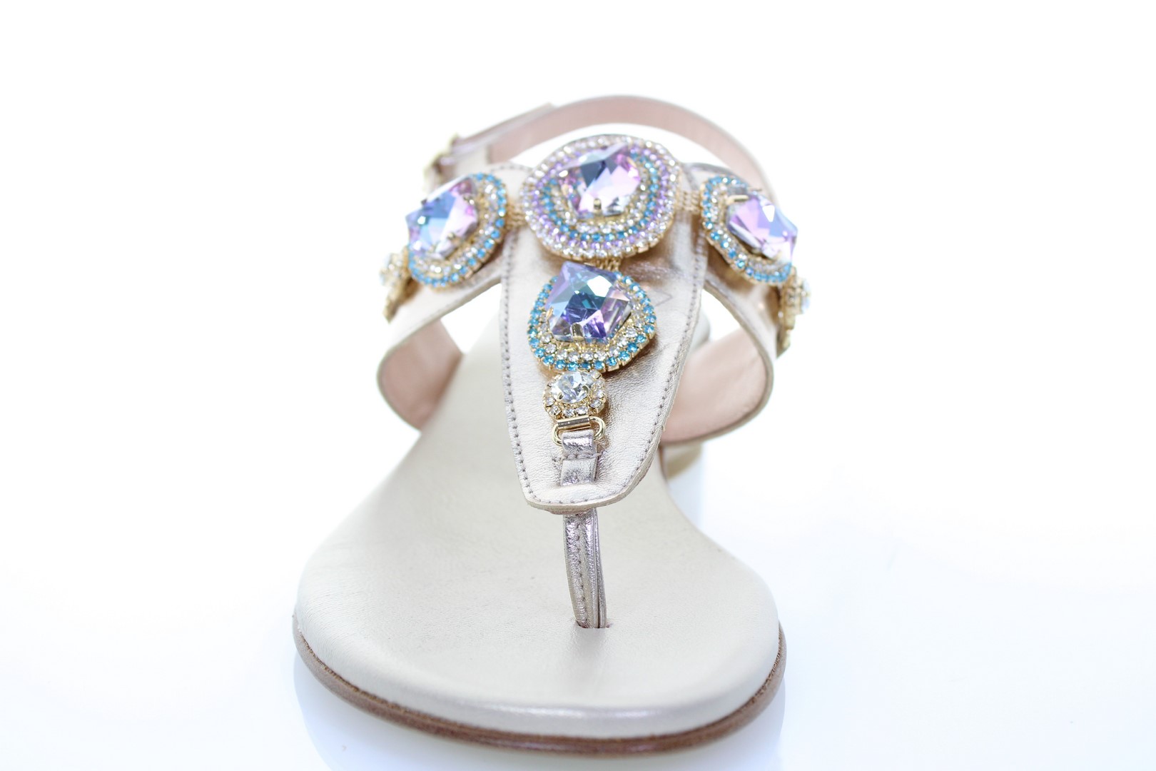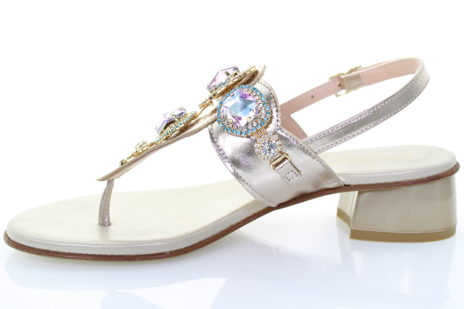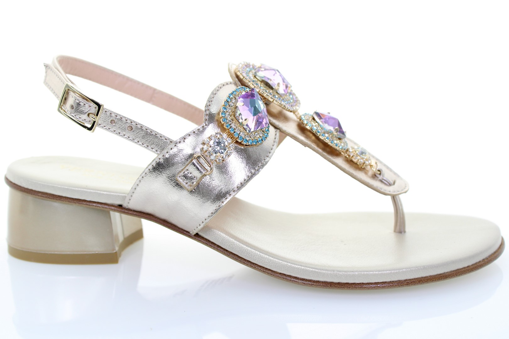 Vivi lo stile Positano di questo sandalo infradito in pelle laminata arricchito con pietre ornamentali, indossalo tutto il giorno senza sforzo grazie alla soletta imbottita in Memory Foam.