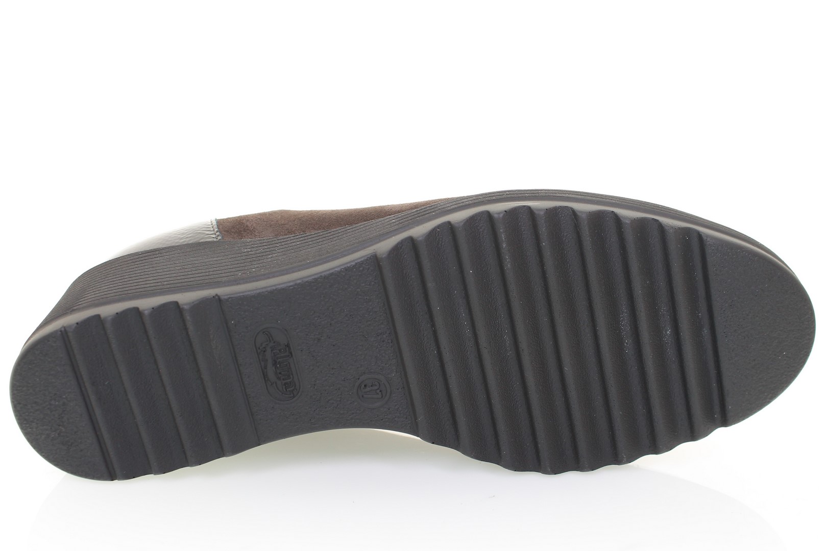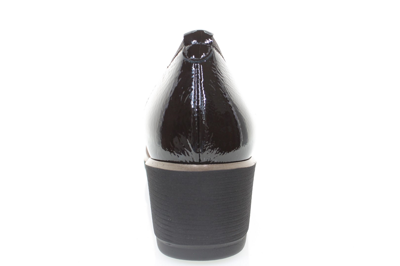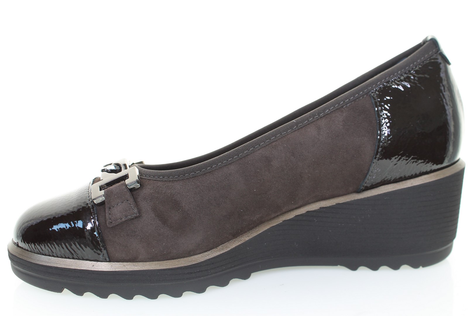 Scarpa in pelle scamosciata con punta e tallone in vernice e accessorio ornamentale, scollo con bordino elastico, fodera in tessuto maglina e pelle, sottopiede pelle, soletta estraibile, fondo in altri materiali altezza 6 cm. Made in Italy