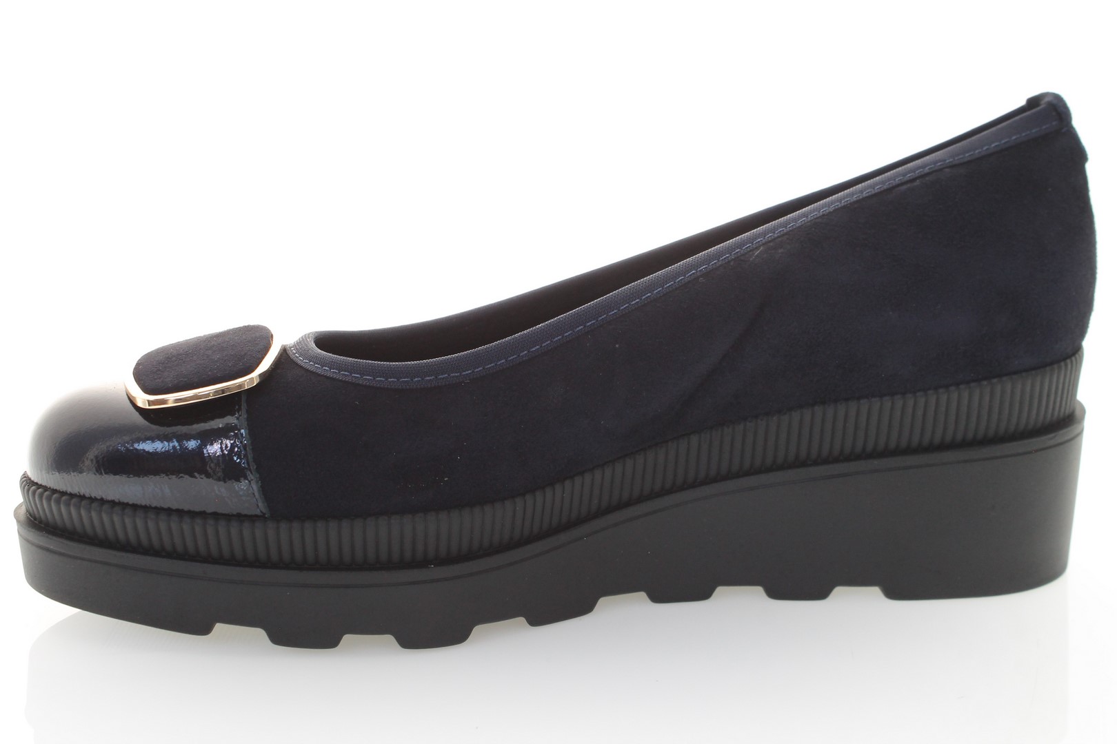 Scarpa in pelle scamosciata con punta in pelle effetto vernice arricchita da accessorio ornamentale, bordino elastico, fodera in tessuto maglina e pelle, sottopiede pelle, fondo in altri materiali altezza 6 cm. 100 % Made in Italy