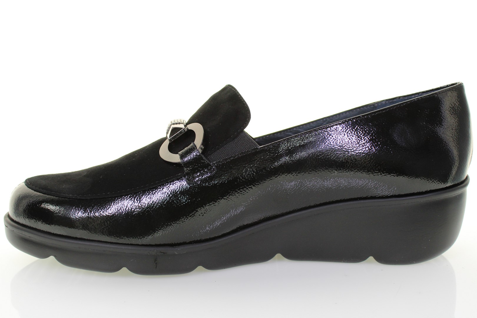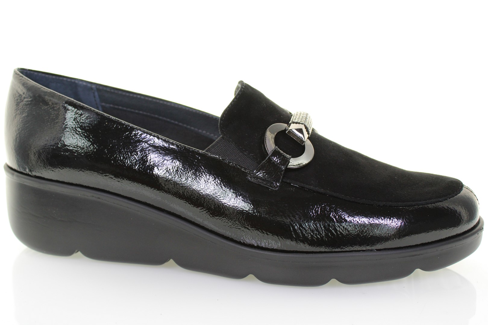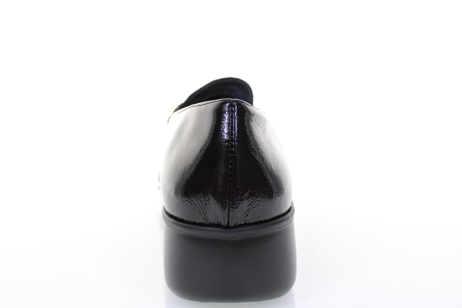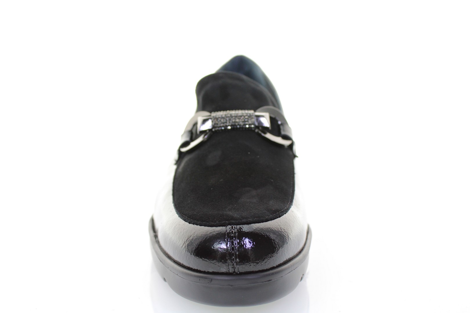 Slip on in pelle naplak con vaschetta in pelle scamosciata arricchita da morsetto ornamentale, elastici sui due bordi dello scollo, fodera in tessuto maglina e pelle, sottopiede pelle, soletta con Memory Foam, zeppa extra light in altri materiali altezza 4 cm. Made in Italy